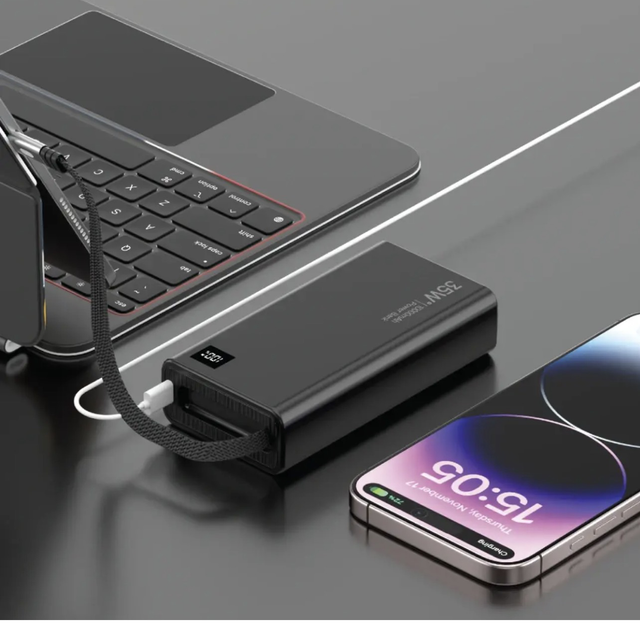 Kraftfuld powerbank med 20000mAh kapacitet og indbygget 75cm Type-C kabel. Understøtter hurtigopladning op til 35W, har LED-display og kompakt design – ideel til rejser og hverdagsbrug.