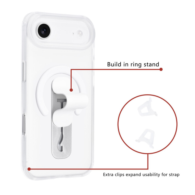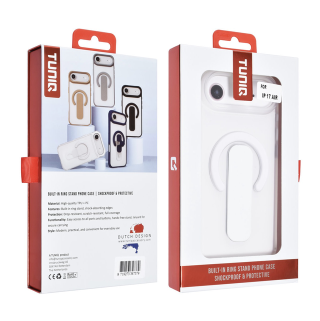 TUNIQ iPhone 17 Air Back Cover i elegant sølv kombinerer stil og beskyttelse. Med indbygget ring stand, forstærkede hjørner og hævede kanter er din iPhone sikret mod stød, ridser og tab – uden at gå på kompromis med et slankt design.
