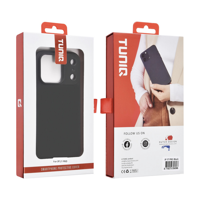 Det stilrene TUNIQ backcover i mat sort giver din iPhone 17 Pro både et moderne look og effektiv beskyttelse. Med forhøjede kamerakanter, præcise udskæringer og bløde kanter får du et cover, der kombinerer funktionalitet med elegant design.