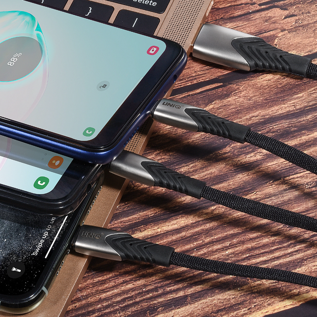 Dette 3-i-1 kabel fra UNIQ Accessory er en smart og fleksibel løsning til alle dine enheder. Med integrerede Lightning-, micro-USB- og USB-C-stik kan du oplade og overføre data hurtigt og nemt – uanset om det er smartphone, tablet eller andet udstyr.
